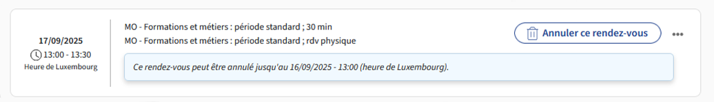 If you are unable to attend your appointment, you can cancel it online via MyGuichet.lu.