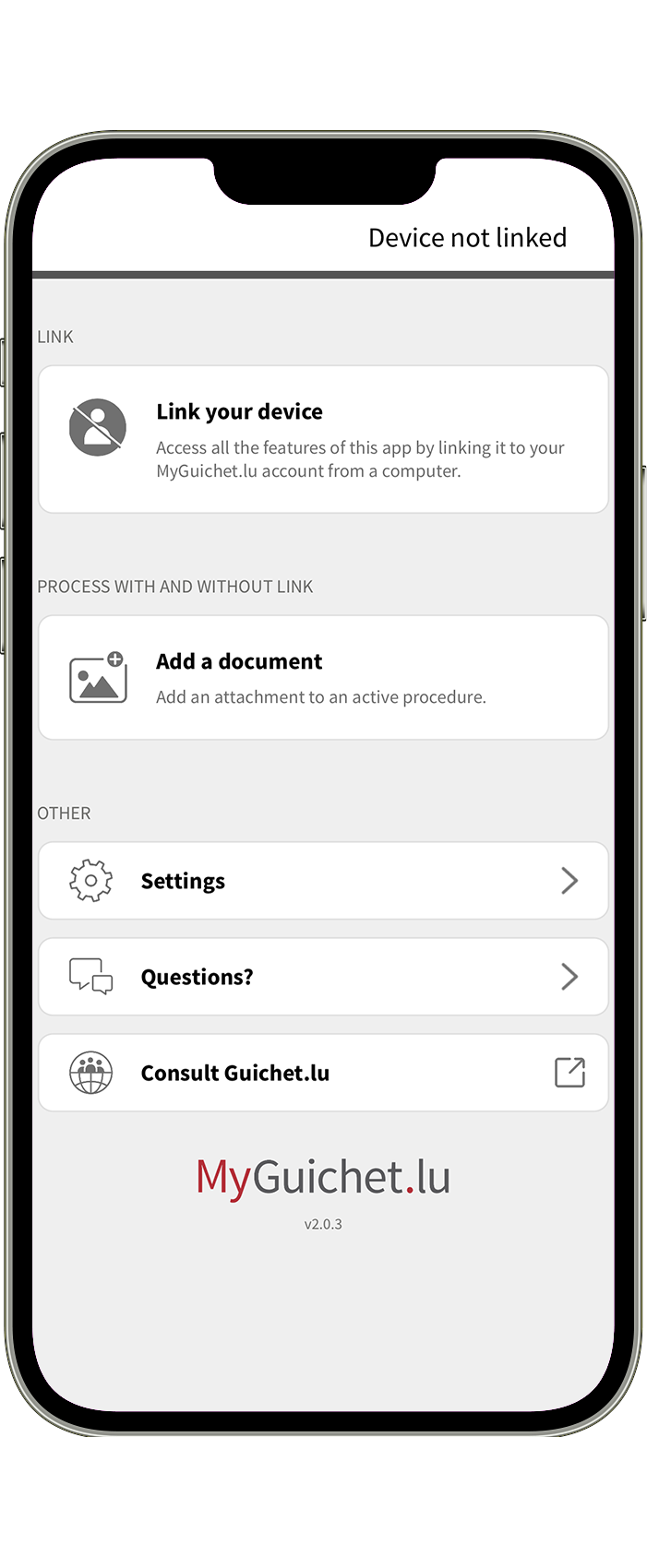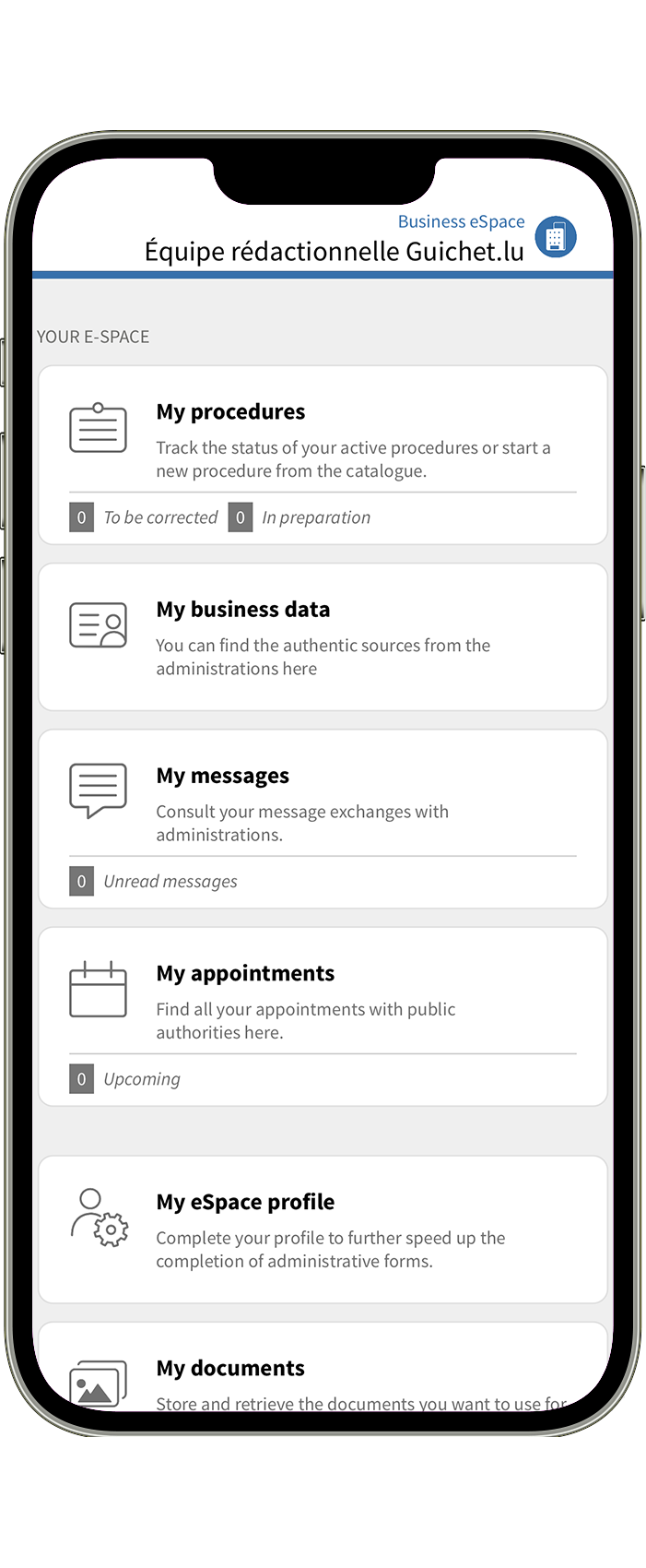 Download our free mobile application MyGuichet.lu, which facilitates access to your online administrative procedures as well as your contacts with Luxembourg administrations and public bodies.